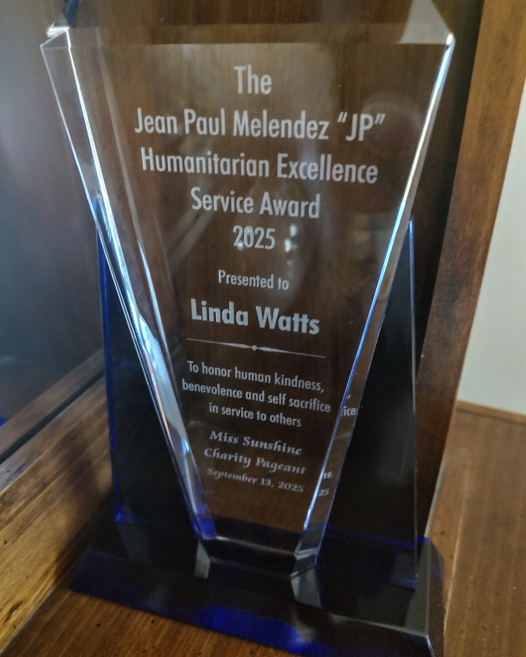 September 2025 Honored to receive the JP Melendez Humanitarian Excellence Service Award from the Sunshine Charity Pageant